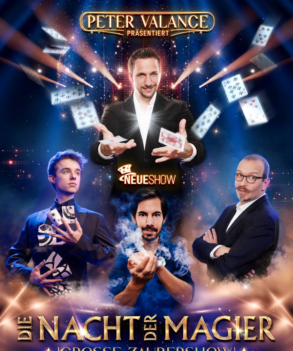 Will­kom­men bei "Die Nacht der Magier" – einer neuen fes­seln­den Zau­ber­show für die ganze Familie, prä­sen­tiert von Peter Valance, der charmant durch den Abend führt. Erleben Sie eine atem­be­rau­ben­de Magic-Show, in der die besten Magier ihres Fachs die Facetten der Magie in einer ein­zig­ar­ti­gen Per­for­mance prä­sen­tie­ren. Tauchen Sie ein in eine Welt voller Il­lu­sio­nen, Magie und fes­seln­der Un­ter­hal­tung, die Jung und Alt in Staunen versetzen wird. Von spek­ta­ku­lä­ren Groß­il­lu­sio­nen bis hin zu hu­mor­vol­ler Comedy Magie – „Die Nacht der Magier“ entführt Sie in eine be­zau­bern­de Welt der großen  Zau­ber­kunst.